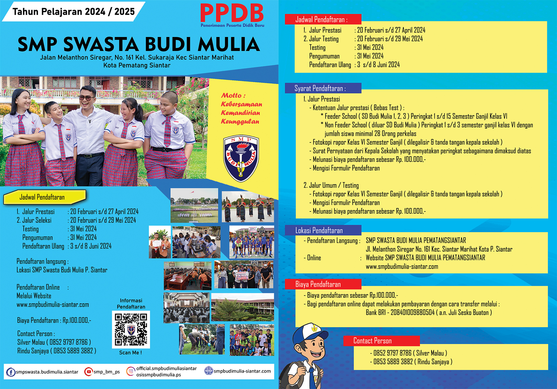 - melakukan transfer biaya pendaftaran terlebih dahulu, bukti transfer disimpan dalam bentuk gambar/foto/dokumen pdf. Biaya pendaftaran dapat dilakukan dengan melakukan transfer ke rekening :Bank BRI - 208401009880504 ( a.n. Juli Sesko Buaton )