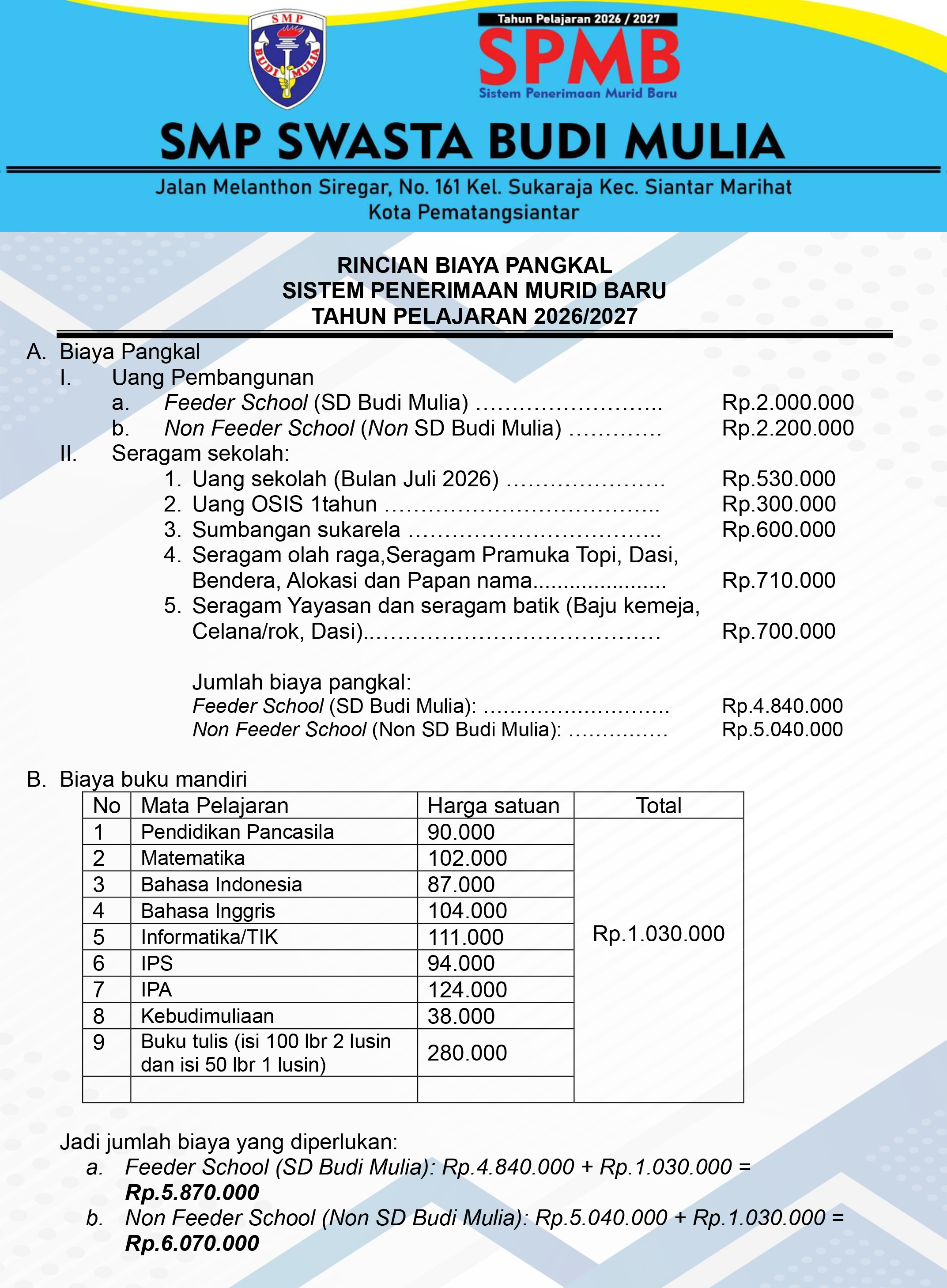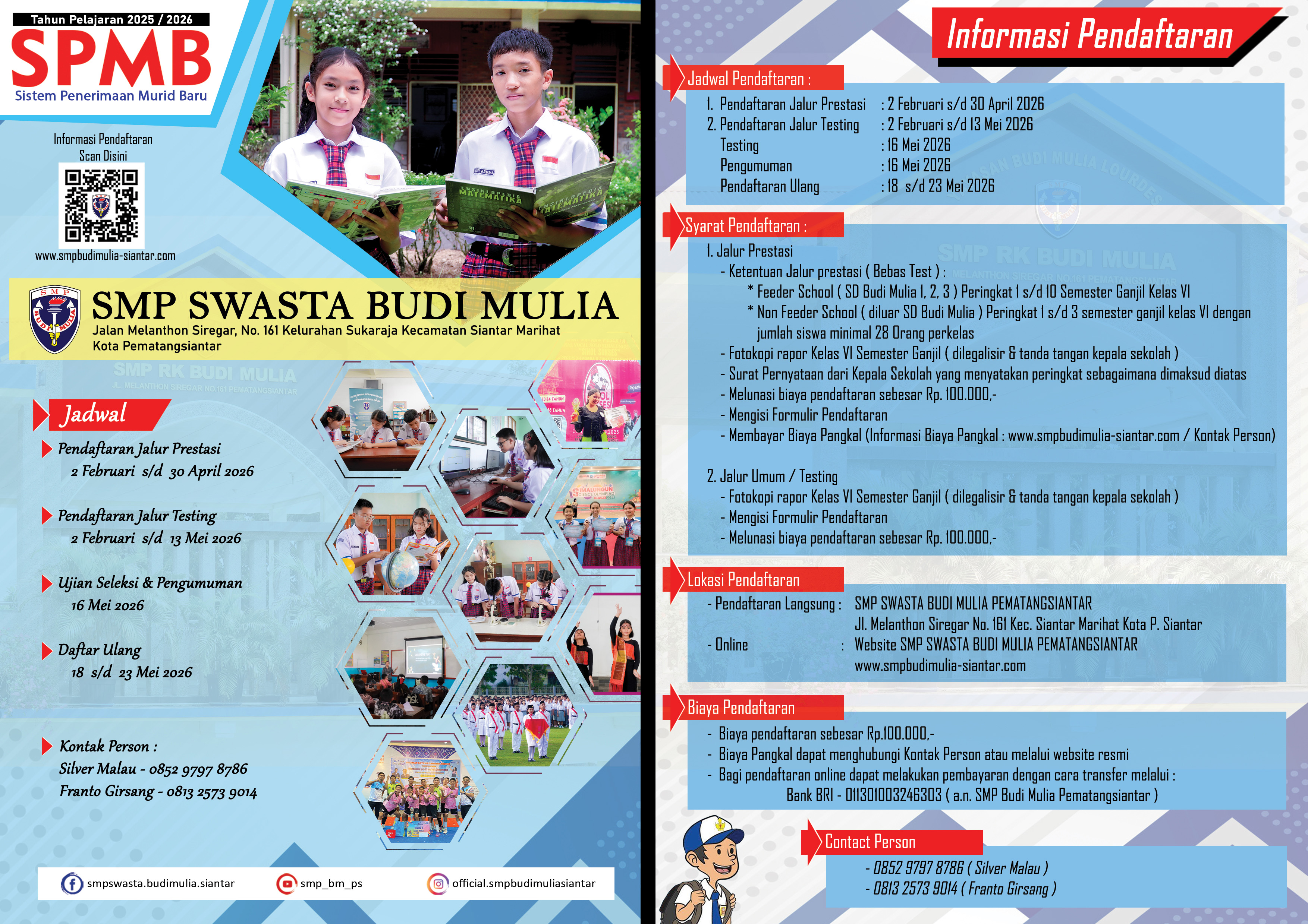 - Transfer melalui Nomor rekening BRI : 011301003246303 (a.n. SMP Budi Mulia Pematangsiantar), Bukti transfer dikonfirmasi dan dikirim melalui nomor kontak panitia