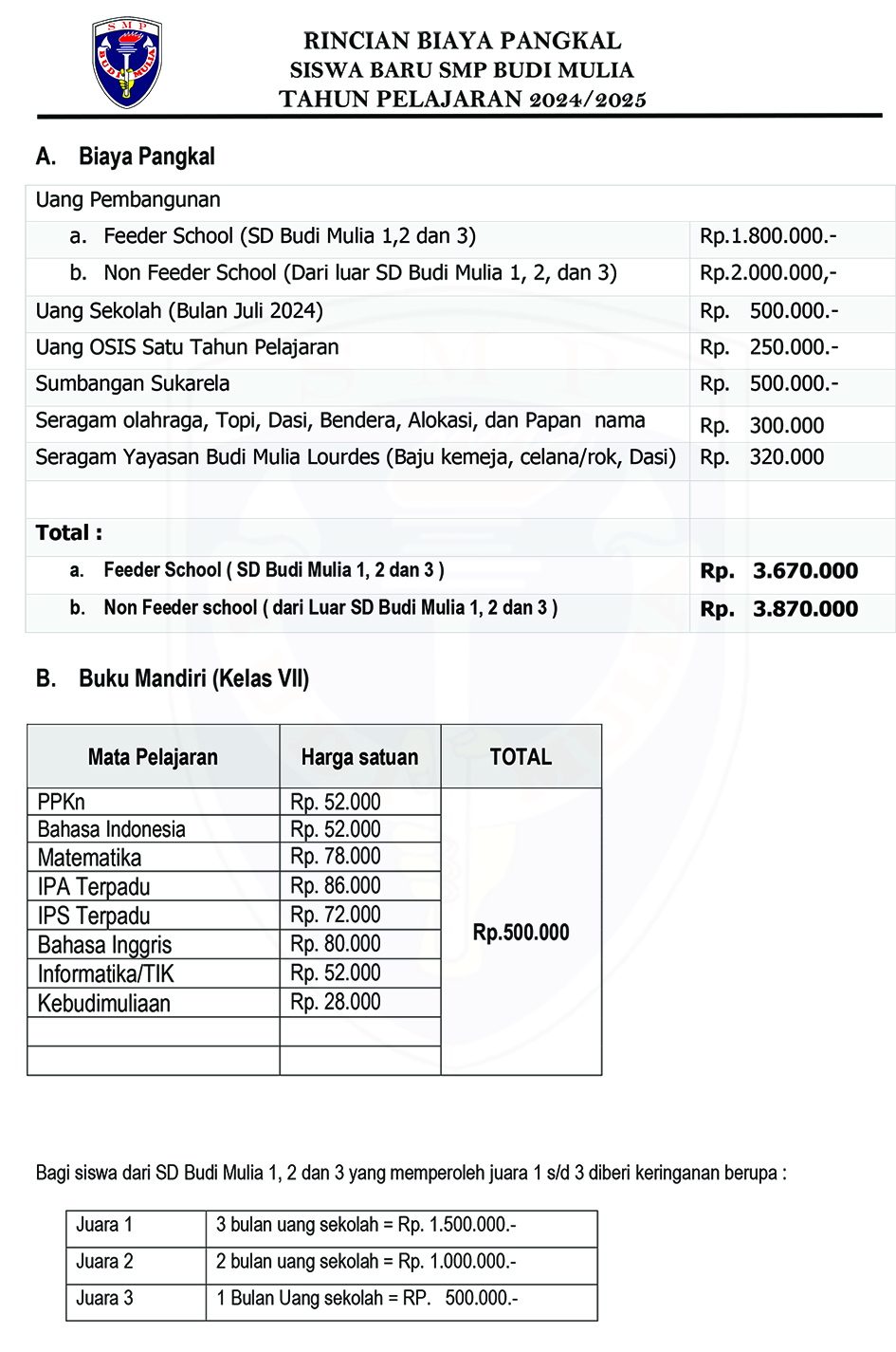 - Feeder School (SD Budi Mulia 1, 2, 3) Peringkat 1 s/d 15 Semester Ganjil Kelas VI